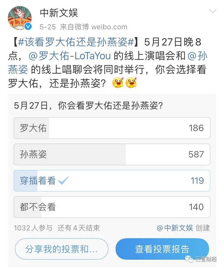 中新文娱还发起了一项投票:5月27日,你会看罗大佑还是孙燕姿?