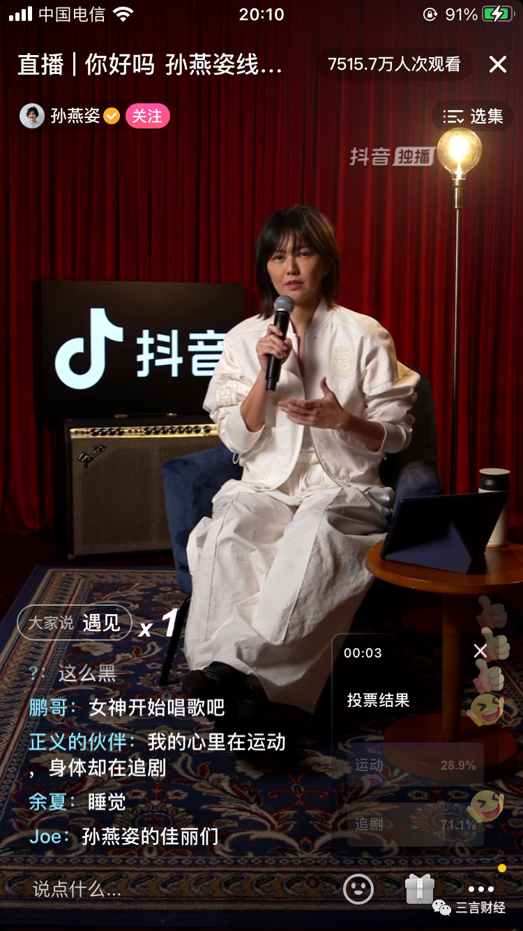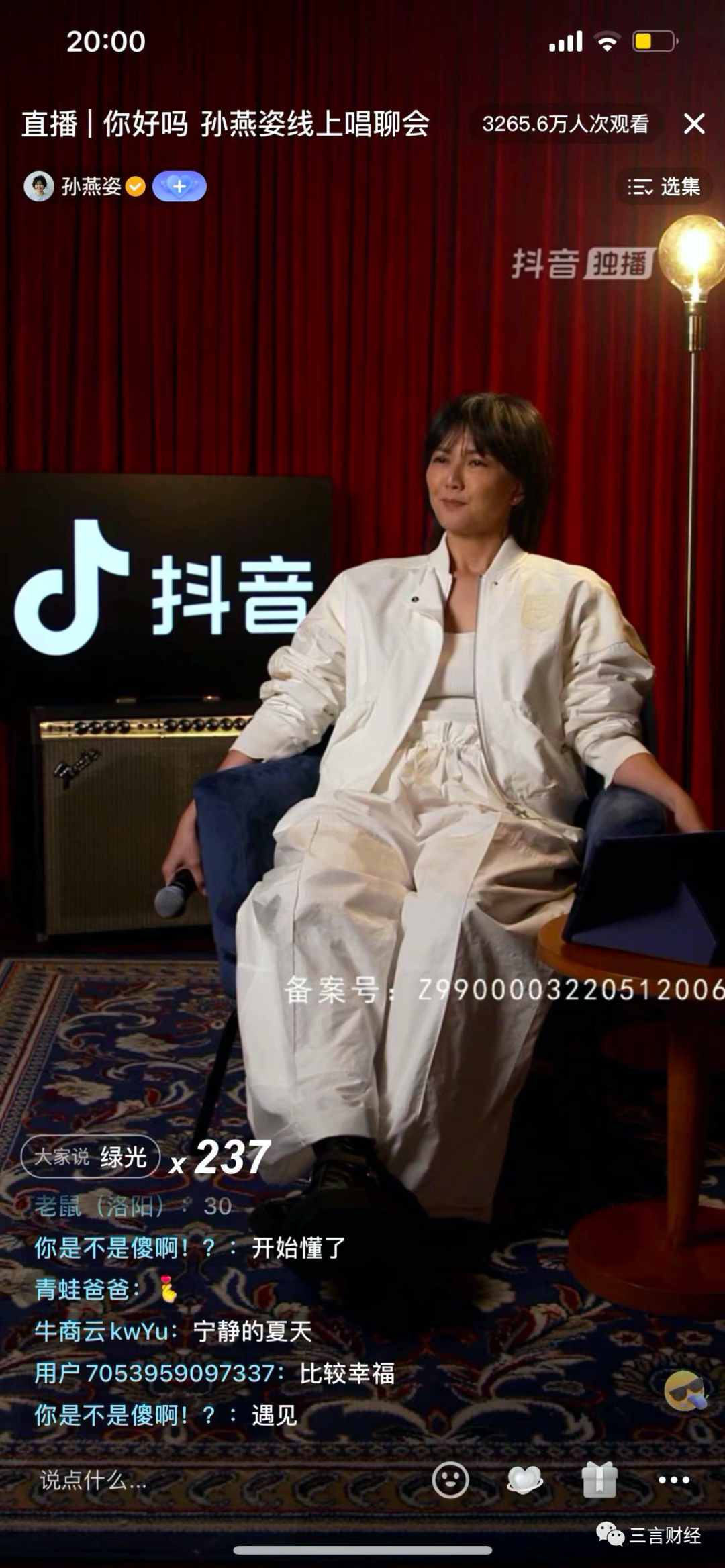 而孙燕姿则是先跟网友聊天,直播间已高达3265.6万观看人次。值得一提的是,孙燕姿此次直播跟上次一样,关闭了刷礼物的功能。