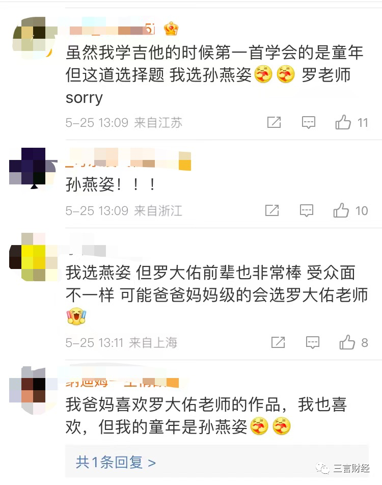 有网友斩钉截铁的选择孙燕姿;有网友对罗大佑一番赞扬,然后选择孙燕姿;也有表示表示父母辈可能会选罗大佑,但自己还是选择孙燕姿。