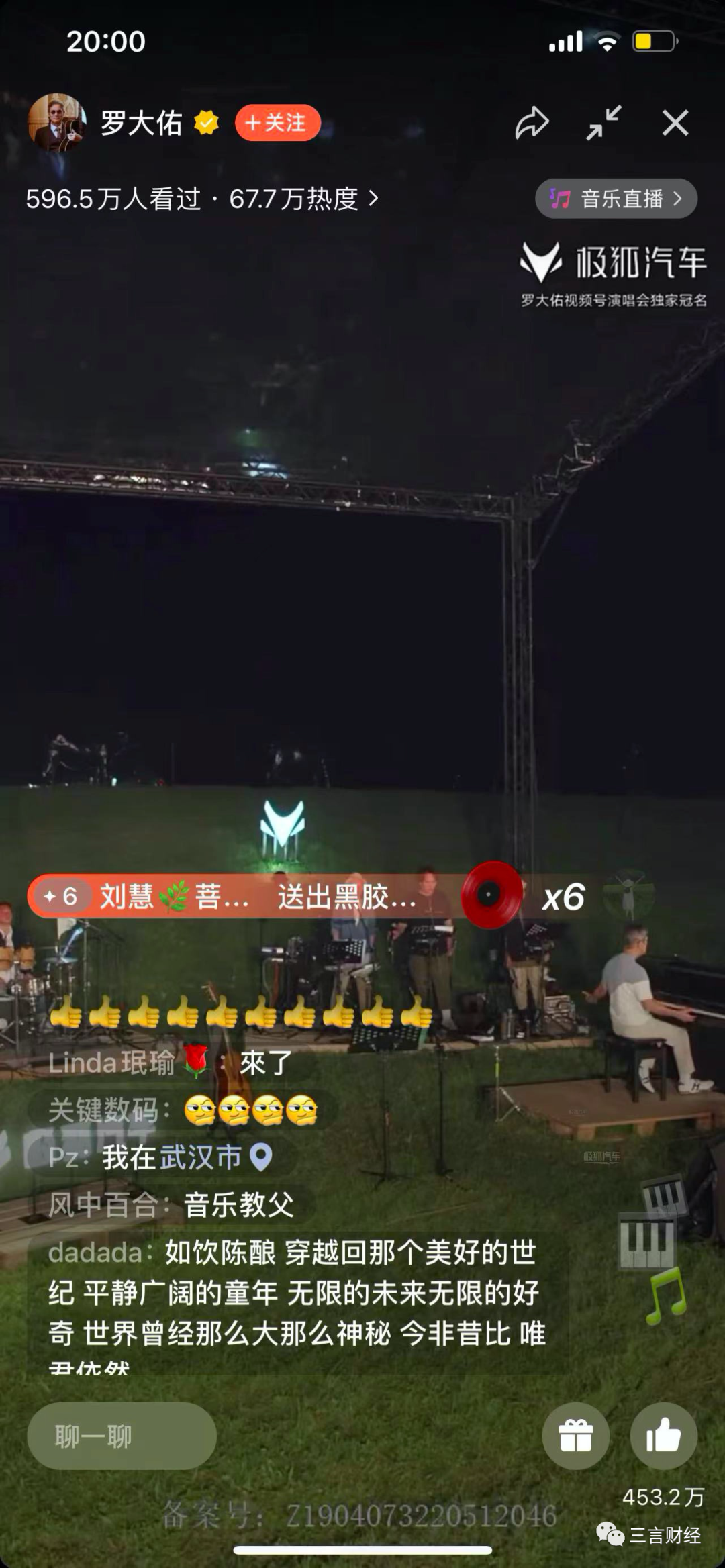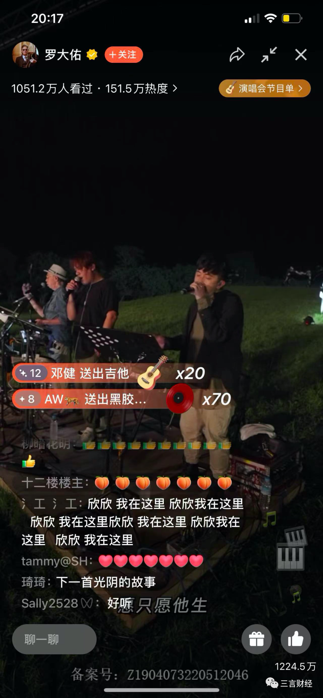 20:00正式开播,罗大佑唱了一首《野百合也有春天》,直播间累计596.5万人看过。