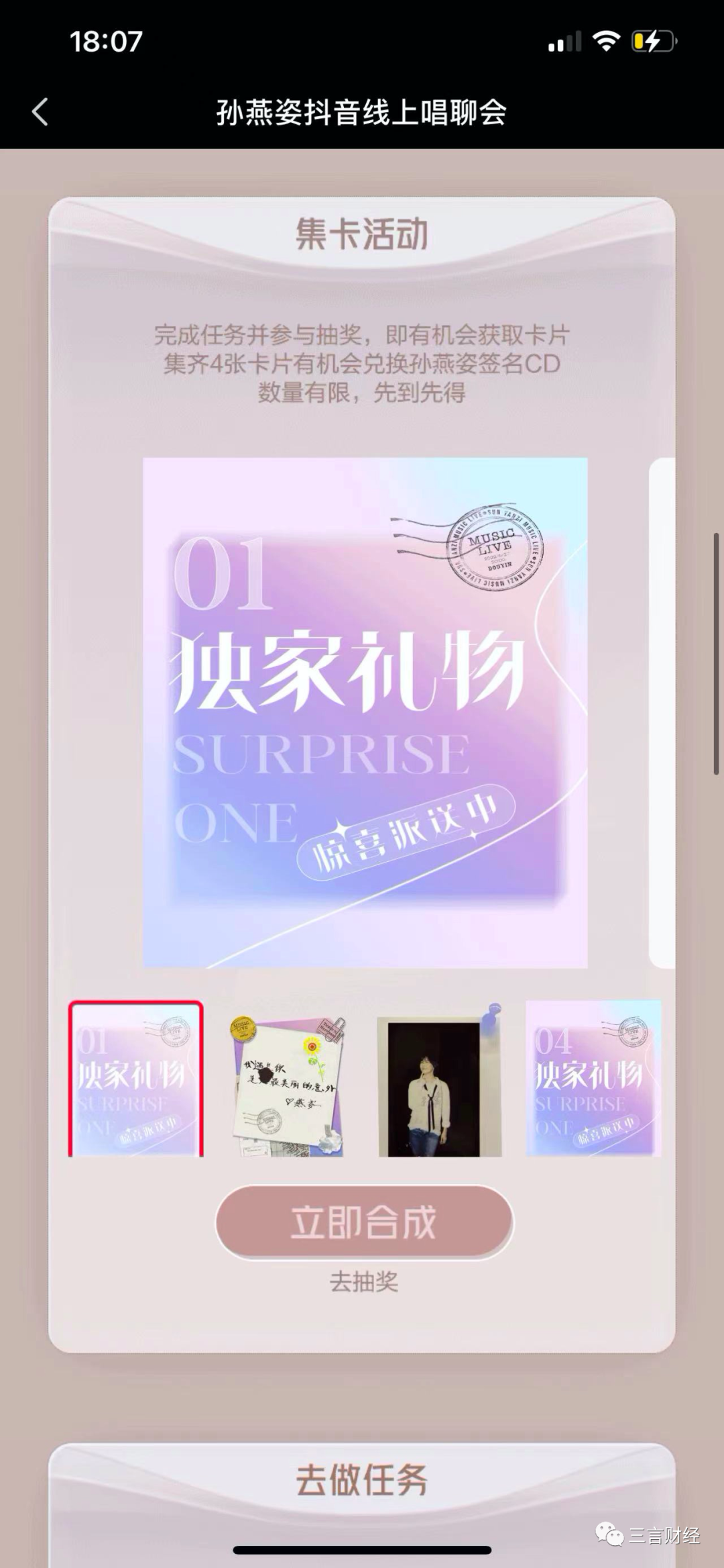 虽然孙燕姿的线上演唱会宣传视频和海报没有冠名商,但这种做任务模式的集卡活动可以激活用户黏性。