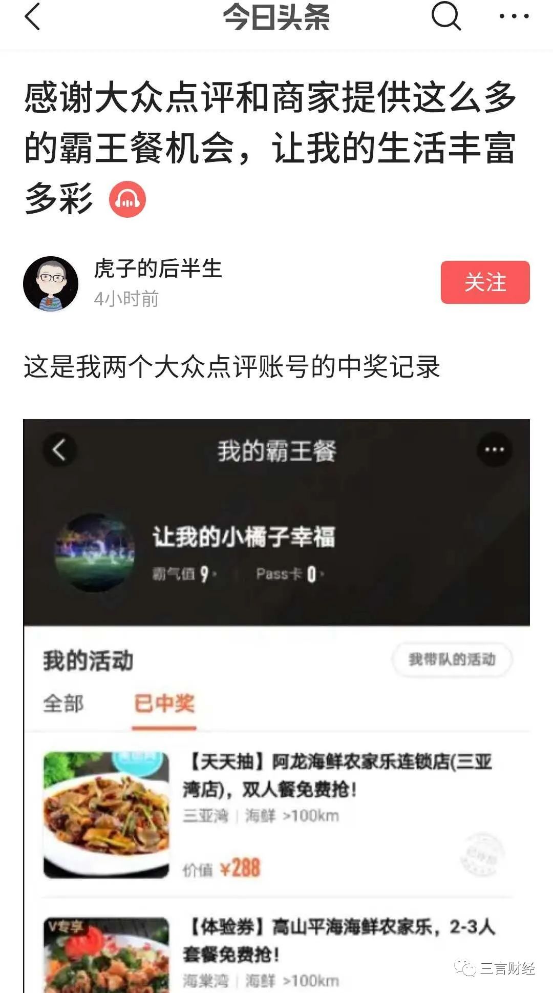 值得注意的是,这与大众点评官方此前的回复不同。虎子提到了有一些是商家慷慨解囊赞助得来的,这似乎解释了为什么平台说一年只有个位数的中奖机会。