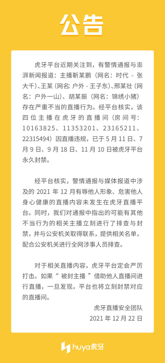 三言财经 12月22日消息,针对“精神残疾女孩被利用做低俗直播”一事,今日晚间,虎牙直播在其官方微博发布公告称,主播靳某鹏(网名:时代-张大千)、王某(网名:户外-王子东)邢某壮(网名:户外一山)、胡某振(网名:锦绣小猪)存在严重不当的直播行为。经平台核实,该四位主播在虎牙的直播间因直播违规,已于5月11日、7月9日、9月18日、11月10日被虎牙平台永久封禁。
