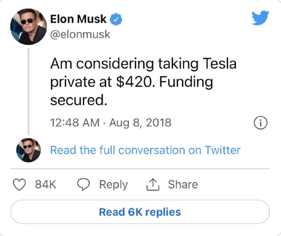 这些股东们声称,在特斯拉股价大起大落的情况下,马斯克在2018年8月发布的 “ 不容争辩的虚假推文”和在推特上的后续推文导致他们损失了数十亿美元的资金。审判定于1月进行。Chen在4月1日裁定,陪审团不可认定马斯克的推文不具有误导性。