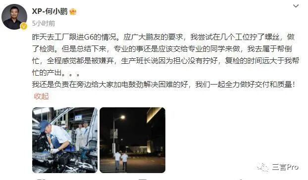 今日,小鹏汽车CEO何小鹏微博发文称,昨天进厂跟进G6的情况,应粉丝的要求亲自尝试在几个工位拧螺丝、做检测。不过他感觉全程都是被嫌弃,因为复检的时间远大于他帮忙的产出。