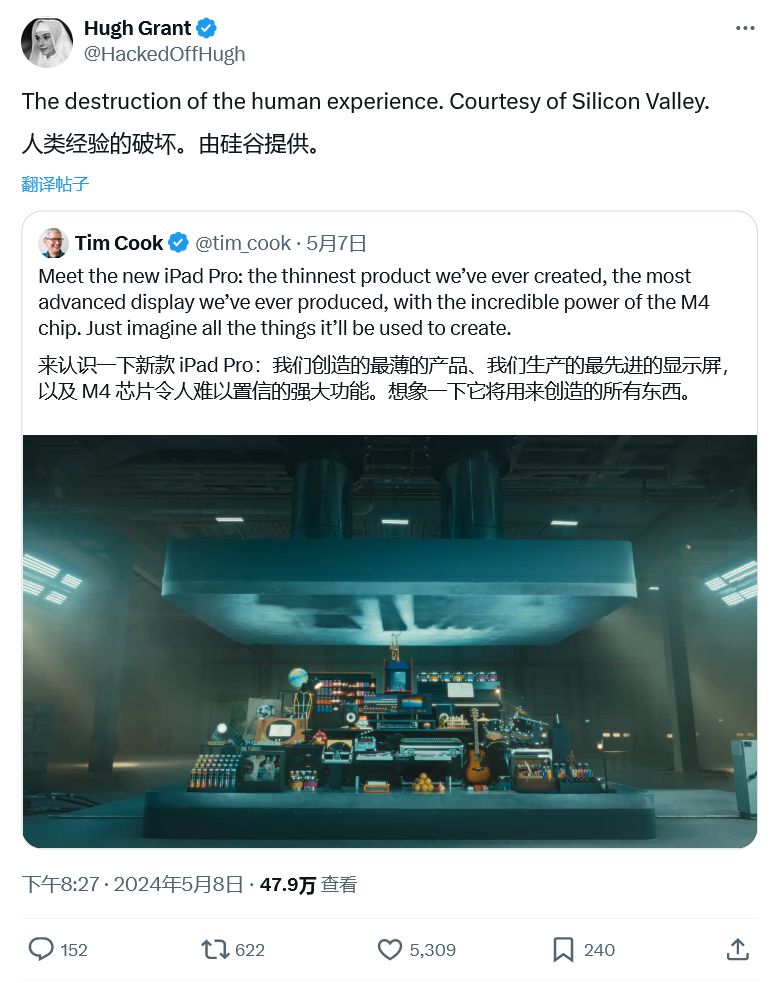 演员休·格兰特对此评论称“人类经验的破坏。感谢硅谷。”
