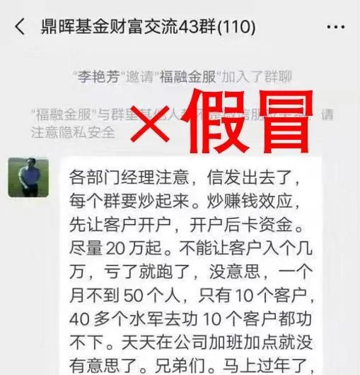经历相似遭遇的还是鼎晖投资。去年11月,一个有关“鼎晖基金财富交流43群”的截屏图片疯传。该截屏图片里的聊天信息称:“各部门经理注意,信发出去了,每个群要炒起来,炒赚钱效应,先让客户开户,开户后卡资金。尽量20万起,不能让客户入个几万,亏了就跑了,没意思……”