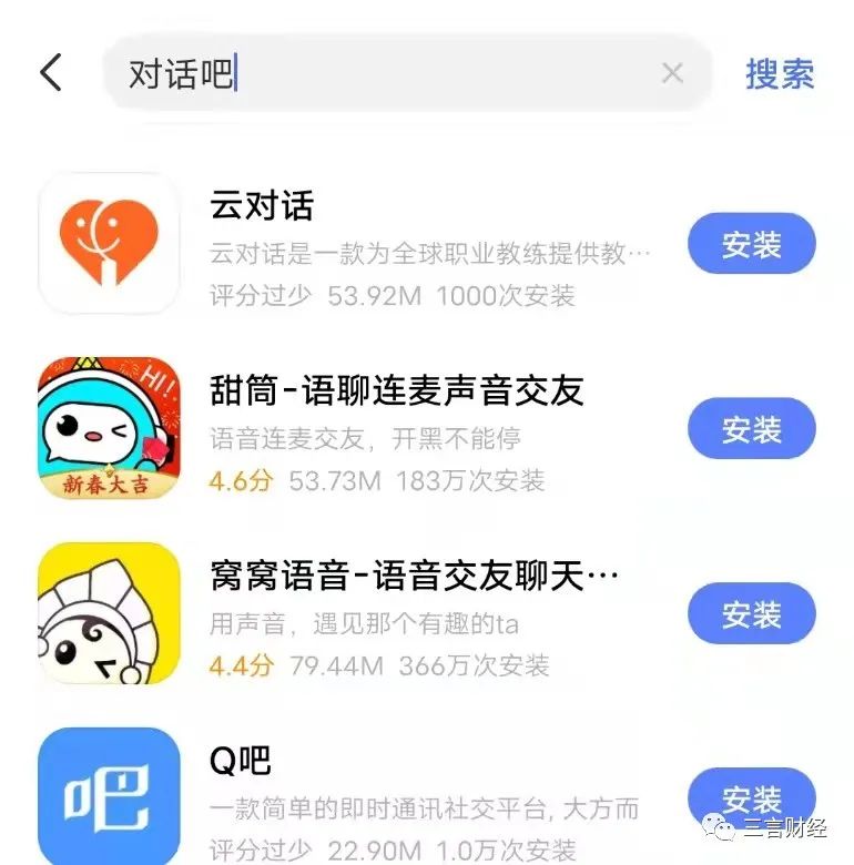 三言财经 2月22日消息,今日,三言财经发现,映客旗下音频社交产品“对话吧”在安卓和苹果商店均下架。