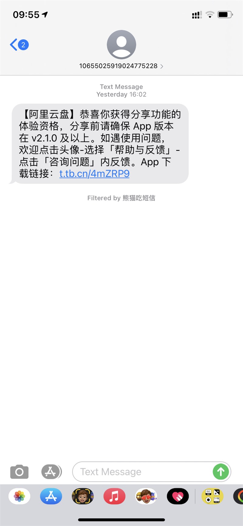感谢IT之家用户热心线索投递,现有部分用户接收到阿里云盘官方发来的短信称,阿里云盘将提供“分享”功能的体验资格给大家,部分拥有测试资格的用户可在 v2.1.0 及以上版本体验。
