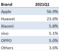 其中,苹果以56.9%的市场份额位居第一,华为排名第二但份额滑落至23.6%,小米OV的份额相差不大,均在5%上下。