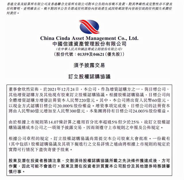 三言财经 12月24日消息,中国信达港交所公告,公司作为增资认购方之一,24日与目标公司、其他增资认购方及其他现有股东订立股权认购协议。根据股权认购协议,目标公司向全体增资认购方增发注册资本人民币220亿元。其中,公司将出资人民币60亿元,以现金方式认购目标公司20.000%股份权益。