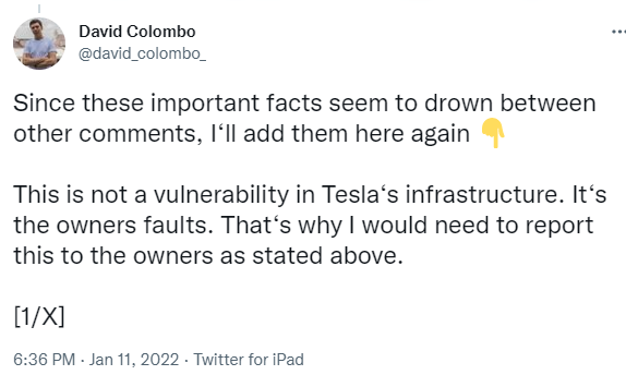 科伦坡并未透露该软件漏洞的详细细节,但表示该漏洞不在特斯拉的软件或基础设施内。另外,科伦坡还表示,全球只有一小部分特斯拉车主受到影响。