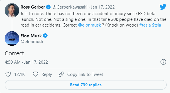 马斯克在Twitter上回应了特斯拉股东罗斯·盖博(Ross Gerber),他证实特斯拉认为在项目启动一年多之后,FSD Beta没有出现任何一次事故。