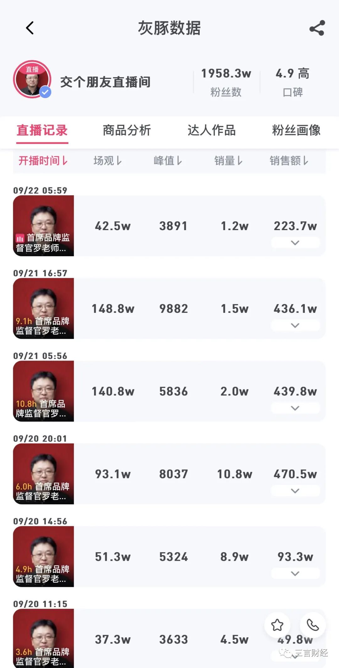 最近交个朋友单日的场观一般都在200万左右人次,销售额大概是600万,20日差不多也是这个数据。