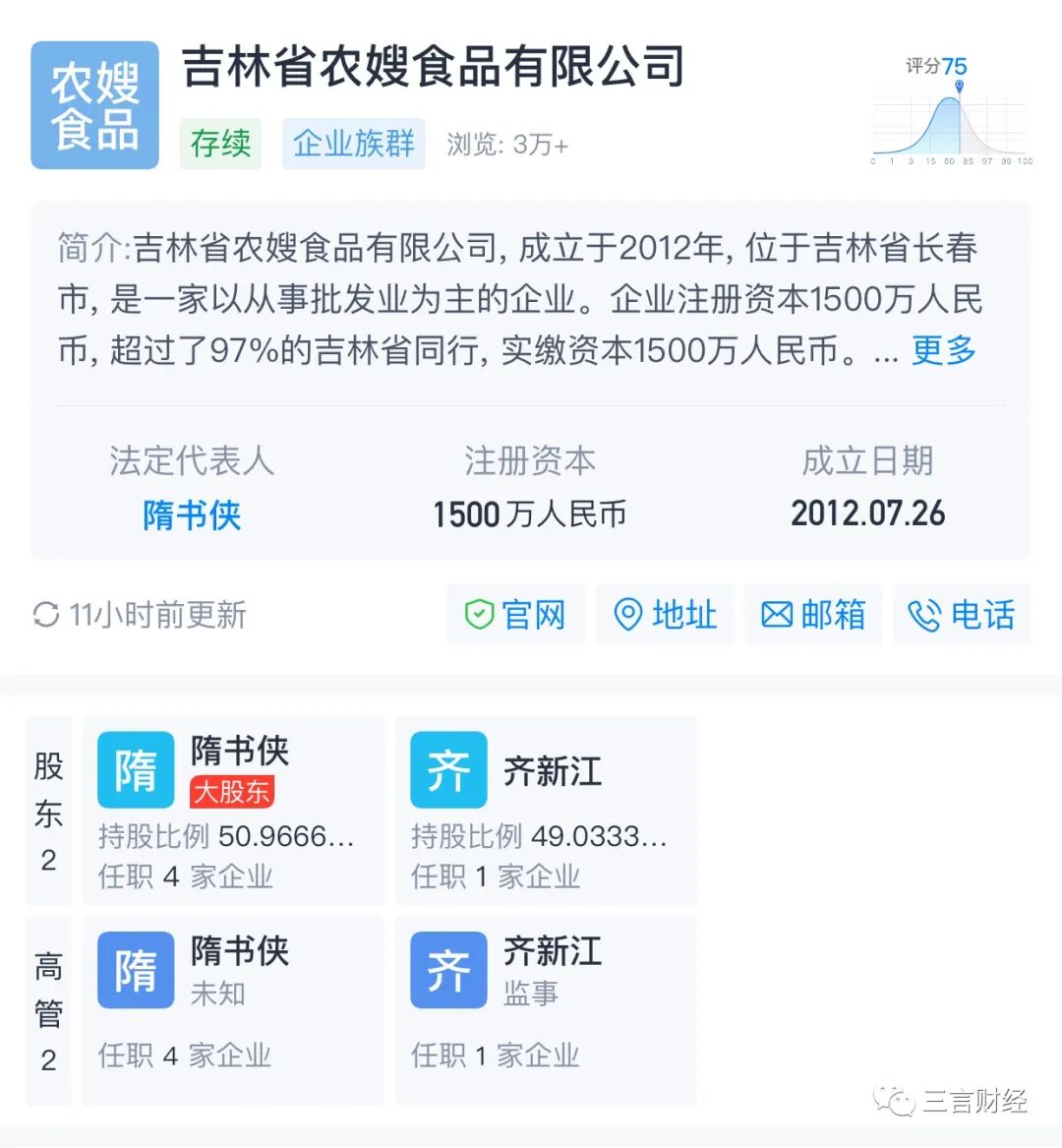 据天眼查,农嫂食品有限公司成立于2012年7月26日,注册资本1500万元,公司大股东为创始人隋书侠,持股比例51%;次股东齐新江,持股比例49