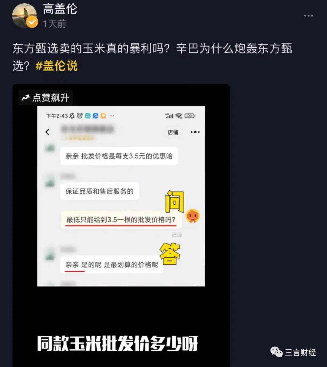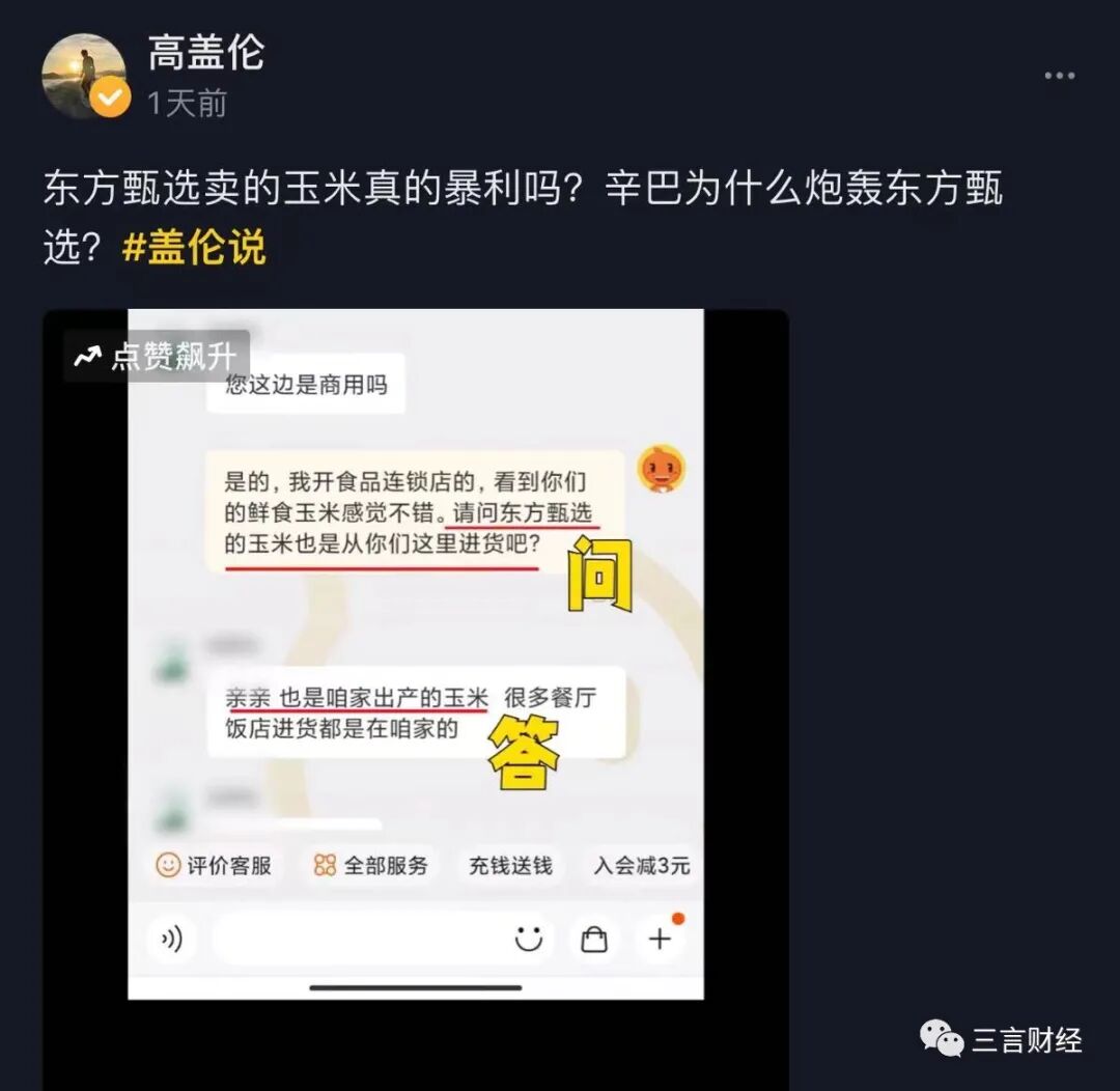这个问题其实是“东方甄选玉米事件”中节外生枝的一个小插曲。