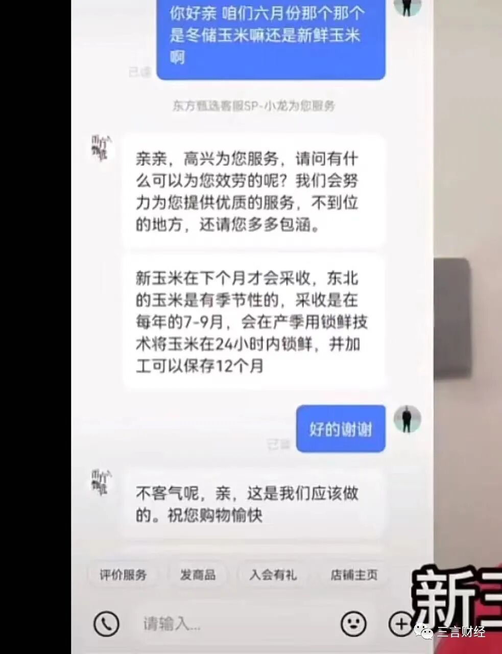 并且有网友就此问题咨询东方甄选客服,对方也确认所售玉米是采用的冬储玉米。但是,今日三言就同样问题咨询东方甄选客服,对方以玉米已下架为由拒绝回答。