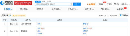 三言科技 2月17日消息,天眼查App显示,近日,蚂蚁区块链科技(上海)有限公司发生工商变更,邹亮卸任法定代表人、董事长,由林逸飞接任。