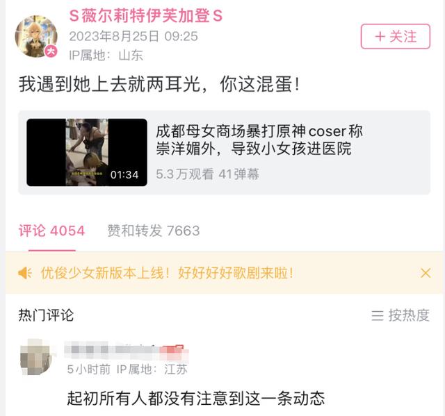 而在上个月,一条「成都母女辱骂原神coser崇洋媚外并且推搡倒地」的视频引起网友关注。彼时,「地铁判官」转发了动态并留言表示:「我遇到她(推搡者)上去就两耳光」。(来源:鞭牛士)