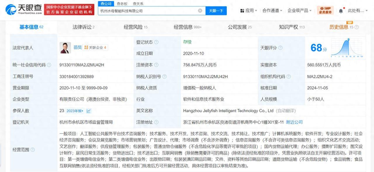 杭州水母智能科技有限公司成立于2020年11月,法定代表人为苗奘,经营范围含人工智能公共服务平台技术咨询服务、信息咨询服务、组织文化艺术交流活动、技术进出口、互联网销售等。股东信息显示,该公司现由北京洛可可科技有限公司、伟旋有限公司、Welight Capital L.P及上述新增股东等共同持股。