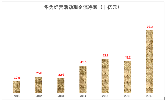 华为现金流更加惊人,2017年经营活动产生的现金流净额达963亿,折合142.8亿美元。日均3912万美元,可购黄金3万盎司(853公斤)。对华为来讲,日进斗金不算什么。