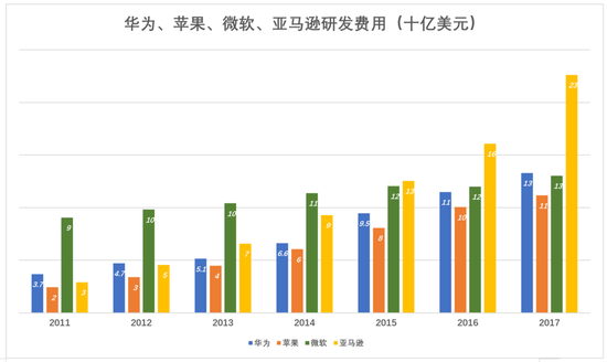 2017财年,华为、苹果、微软、亚马逊的研发投入分别为133亿美元、112亿美元、130亿美元和226亿美元。华为仅次于亚马逊。