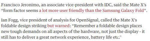 文章还援引IDC副总裁弗朗西斯科·杰罗尼莫(Francisco Jeronimo)的话表示,华为Mate X的“外形因素似乎比三星Galaxy折叠屏手机友好得多”。
