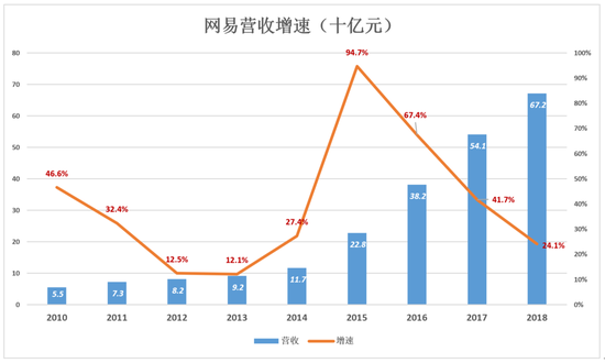 2010年以来,网易营收从55亿增至672亿,年均复合增长率为36.7%。尽管不算甚高,但贵在坚持,2018年营收已是2010年的12.2倍。