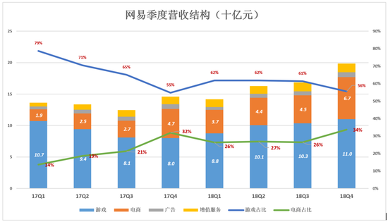从2017年报开始,网易把营收分为游戏、电商、广告、邮箱及其它业务两个部分,刚好对应互联网四大变现模式(游戏、电商、广告、增值服务)。