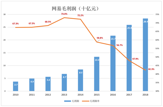 2010年,网易营收、净利润分别为55.1亿和22.3亿,净利润率36.5%;2018年,网易营收、净利润分别为671.6亿和64.8亿,净利润率仅为3.0%。