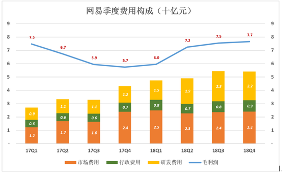 用蓝色折线代表毛利润,彩色堆叠柱代表市场、行政、研发费用。毛利润“淹没”费用时,企业才能获得经营利润,从下图可以看出网易的举重若轻——