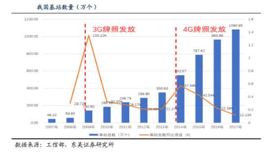 整个3G、4G基站建设,在牌照发放后约1年的时间内,是基站建设增速的波峰;3G牌照发放后,2009年基站站数同比增加135.12%,2014年基站数同比增加57.59%。