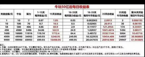 根据牛玩官方的说法,当牛币产量到50亿的时候,就会触发所谓的防挖空机制,规则改为通过算力挖牛币。而算力的获得同样需要通过充值,每充值一元钱可以获得7个算力,每个算力每天的收益为0.01元。