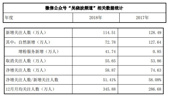 公告中称,巴九灵在2017年和2018年均为微信公众号“吴晓波频道”采购了外部增粉服务,其中,2017年通过外部渠道累计新增公众号关注用户人数8,467人,占2017年全年累计新增公众号关注用户的0.66%,2017年采购增粉服务所产生费用账面合计约1万元;2018年通过外部渠道累计新增公众号关注用户41.74万人,占2018年全年累计新增公众号关注用户的36.45%,2018年采购增粉服务所产生费用账面合计约40.02万元。