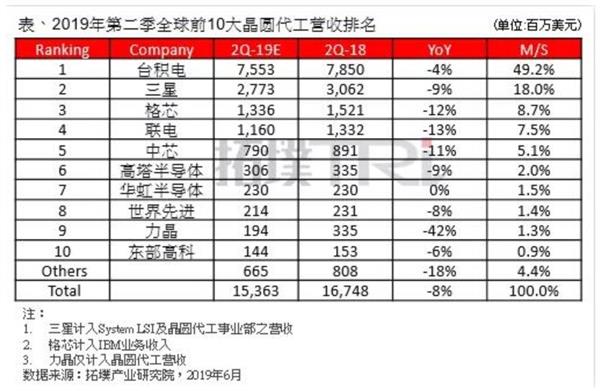 集邦科技旗下的拓墣产业研究院日前发布了2019年Q2季度全球TOP10晶圆代工厂榜单,受整体市场下滑的影响,Q2季度10大厂商的营收几乎都在下滑,当季总营收只有153.6亿美元,同比下滑了8%。