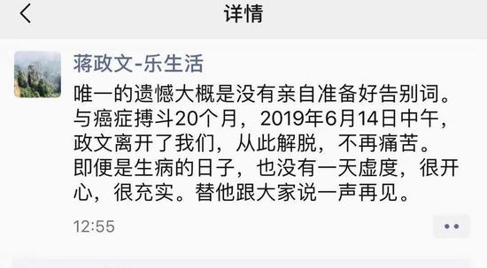 今日蒋政文亲朋在其微信朋友圈代笔告别词:“与癌症搏斗20个月,2019年6月14日,政文离开了我们,从此解脱,不再痛苦。即便是生病的日子,也没有一天虚度,很开心,很充实。替他跟大家说一声再见。