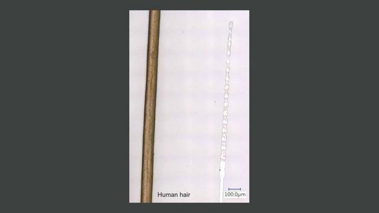 最终的结果是,Neuralink的“微电极阵列”在自身直径大约30-40微米,实现单根阵列布置64个电极。因为头发直径一般是80微米左右,你最终看到的Neuralink微电极阵列就像一根根“头发丝”。
