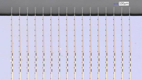但你千万不要因为“头发丝”不起眼就看不起它,虽然它比起传统的微电极阵列小许多,但是因为电极线性排布、且数量很多,反倒能够构建起一个密集的立体电极网络。这一点完全可以超越传统的二维微电极网络,也必将帮助科学家采集到更多有用的神经电信号。