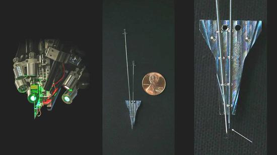 那么上面的微电极“头发丝”是怎么被送入大脑的呢?这就不能不提微电极的另外一个“微结构”:顶端的拉环。负责刺入大脑的针尖先会穿进这个环,然后通过这个环拽着整根“头发丝”一起进入大脑,到达指定深度之后,针就会往回抽,然后把“头发丝”留在大脑之中。一根“头发丝”只需要一次穿刺,伤口自然就最小。