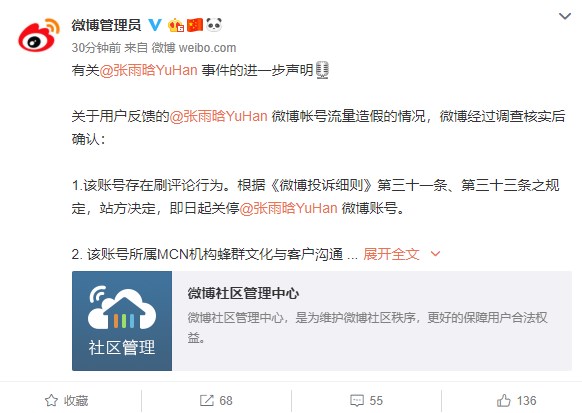 关于用户反馈的@张雨晗YuHan 微博帐号流量造假的情况,微博经过调查核实后确认: