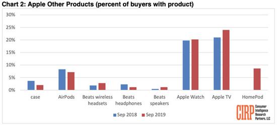 在这份报告中可以看到,Apple TV以接近25%的用户拥有率继续保持着该公司拥有最多产品的领先地位,紧随其后的则是Apple Watch--拥有率约为20%、HomePod和AirPods--拥有率在5%至10%之间。尽管榜单上的大多数产品的拥有率跟2018年9月的水平相当,但Apple TV的拥有率有所增长、HomePod的拥有率似乎超过了保护套和Beats设备。
