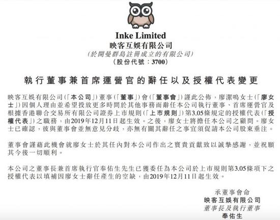 映客董事长兼CEO奉佑生已获委任为本公司于上巿规则第3.05条项下之授权代表以填补因廖洁鸣辞任产生的空缺,由2019年12月11日起生效。
