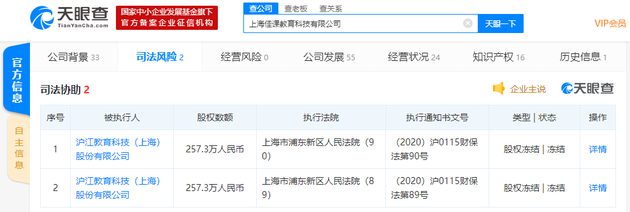 三言财经2月13日消息,,天眼查数据显示,近日,上海佳课教育科技有限公司新增司法协助协议,其大股东沪江教育科技(上海)股份有限公司价值257.3万人民币的股权、其它投资权益遭到冻结,执行法院为上海市浦东新区人民法院,冻结期限自2020年2月11日至2023年2月10日。