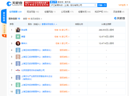 天眼查股东信息显示,沪江网的股东中,包括沪江网创始人伏彩瑞为实际控制人的上海互捷企业管理咨询合伙企业(有限合伙)(原名:上海互捷企业管理咨询合伙企业(有限合伙))、涌金系陈金霞、北京百度网讯科技有限公司等。