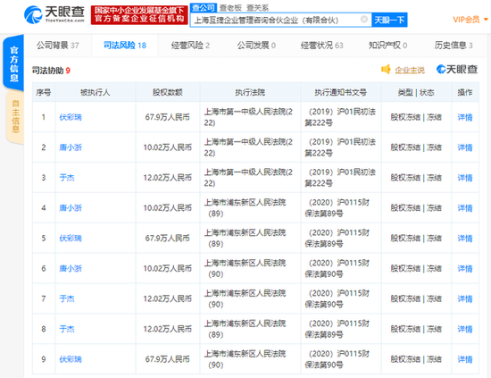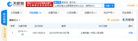 2019年11月20日,上海互捷企业管理咨询合伙企业(有限合伙)被上海市第一中级人民法院列为被执行人,执行标的约1.44亿元。此外,该公司也有多条司法协助信息,其中伏彩瑞有多条股权冻结信息。