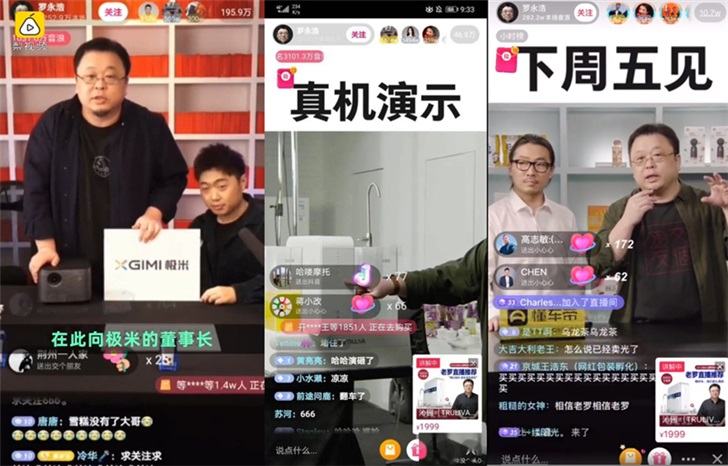 4月1日,在罗永浩的抖音直播首秀中说错品牌名,在介绍“极米投影仪”时误说成了“坚果投影仪”。经身旁的工作人员提醒后,罗永浩立马起身并90度鞠躬表示对极米道歉,还调侃希望看到自己秃了的头皮后,能够原谅自己的老年人痴呆,并表示会找极米董事长当面道歉。随后,罗永浩一度吓得退出屏幕去“冷静”。