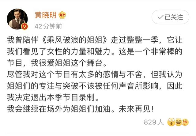 黄晓明直言,“尽管我对这个节目有太多的感情与不舍,但我认为姐姐们的专注与突破不该被任何声音所影响,因此我决定退出本季节目录制。黄晓明还说,“我会继续在场外为姐姐们加油。未来再见。”