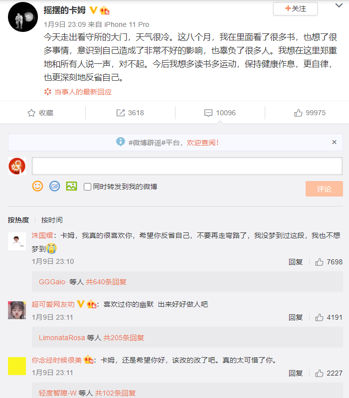 三言财经 1月10日消息,昨日晚间脱口秀演员卡姆发文称自己出狱了,并发文向大家道歉,“这八个月,我在里面看了很多书,也想了很多事情,意识到自己造成了非常不好的影响,也辜负了很多人。今后我想多读书多运动,保持健康作息,更自律,也更深刻地反省自己。”