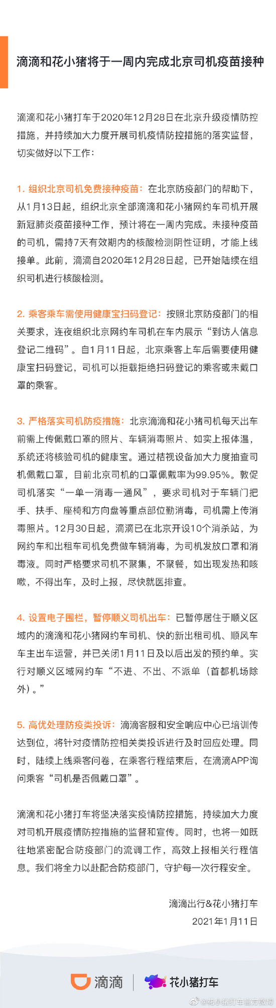 三言财经 1月11日消息,今日晚间,滴滴出行在官方微博发文称,滴滴和花小猪将于一周内完成北京司机疫苗接种 。