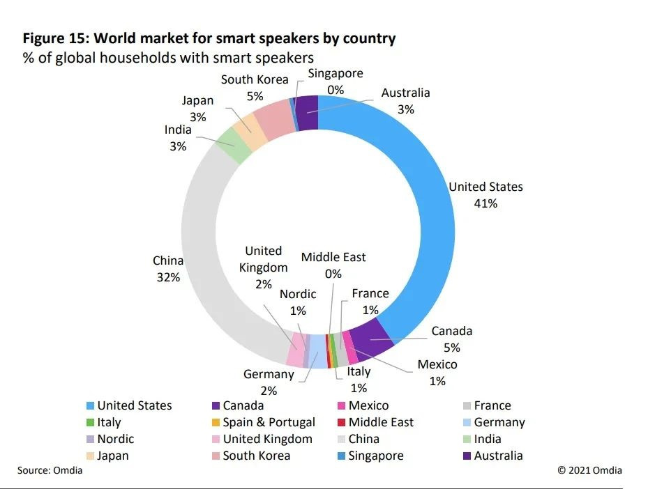 根据Omdia在2020年中对33个国家和地区的34,205名受访者进行的调查,16.7%的受访者表示他们拥有一个智能音箱。考虑到受访者和总家庭的加权平均数,这相当于22.8%的家庭拥有一个智能音箱。使用同样的调查方法显示,3.4%的家庭拥有两个音箱,0.9%的家庭拥有三个智能音箱。